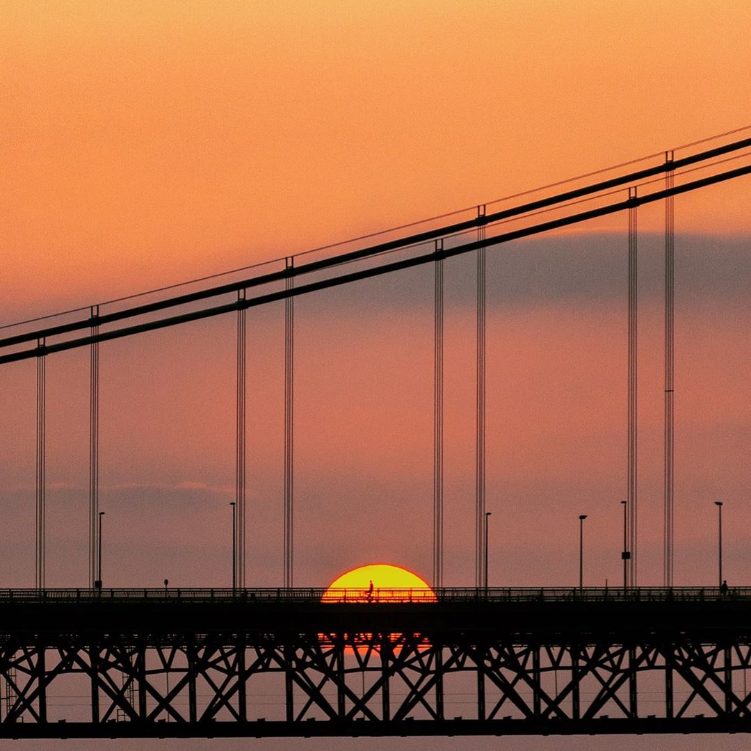 Cyclist crossing the Forth Road Bridge at sunset.